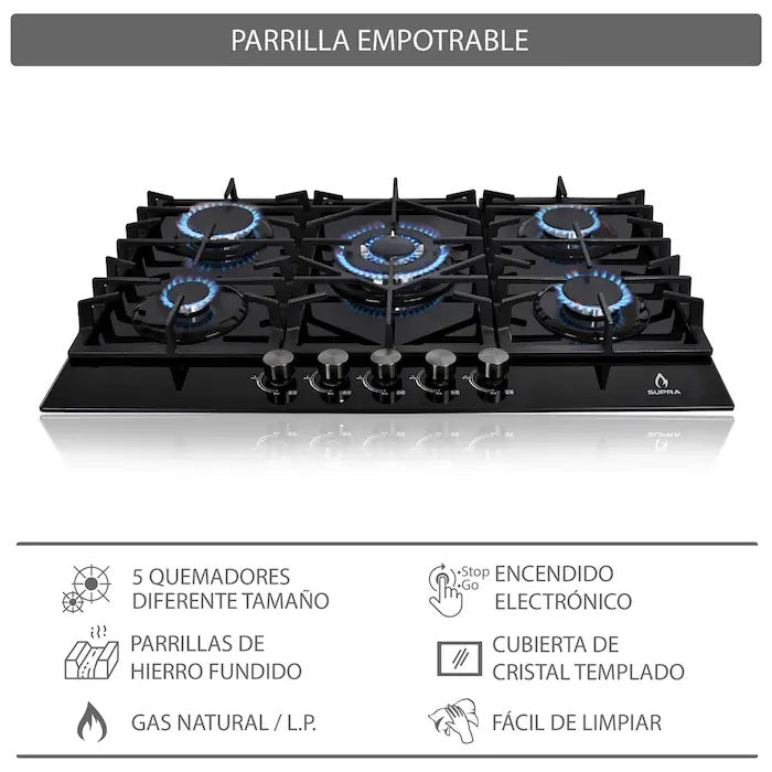 Parrilla Empotrable A Gas Supra SENZA 76 De Cristal 5 Quemadores 76CM